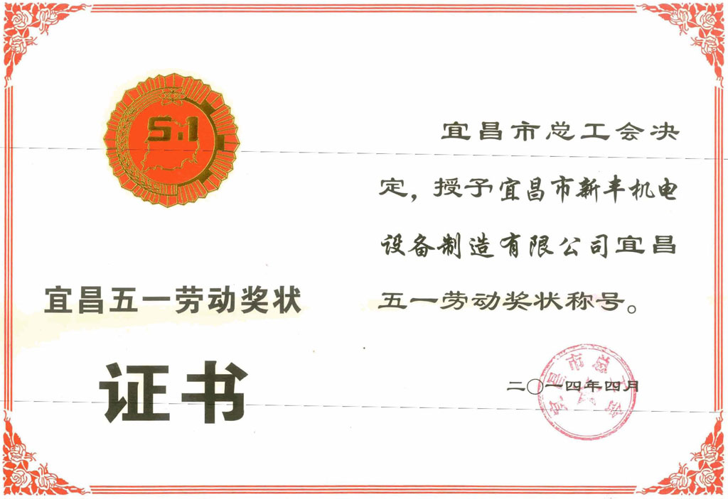 新豐機(jī)電獲宜昌五一勞動(dòng)獎(jiǎng)狀