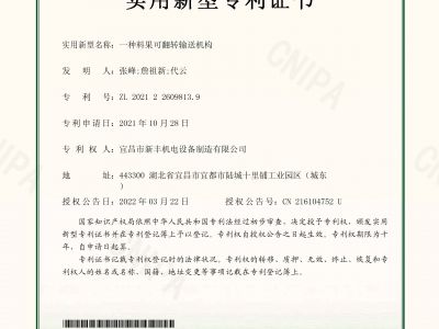 實用新型專利證書《一種料果可翻轉(zhuǎn)輸送機構(gòu)》