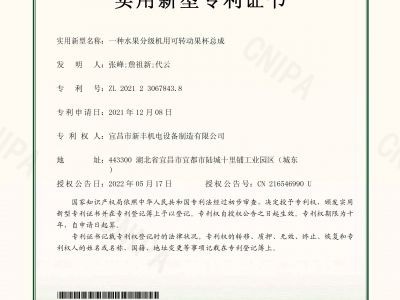 實用新型專利證書《一種水果分級機用可轉(zhuǎn)動果杯總成》
