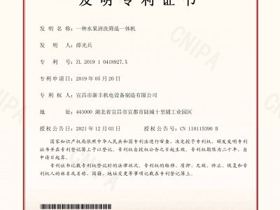 實用新型專利證書《一種環(huán)形加工的水果分選機(jī)》